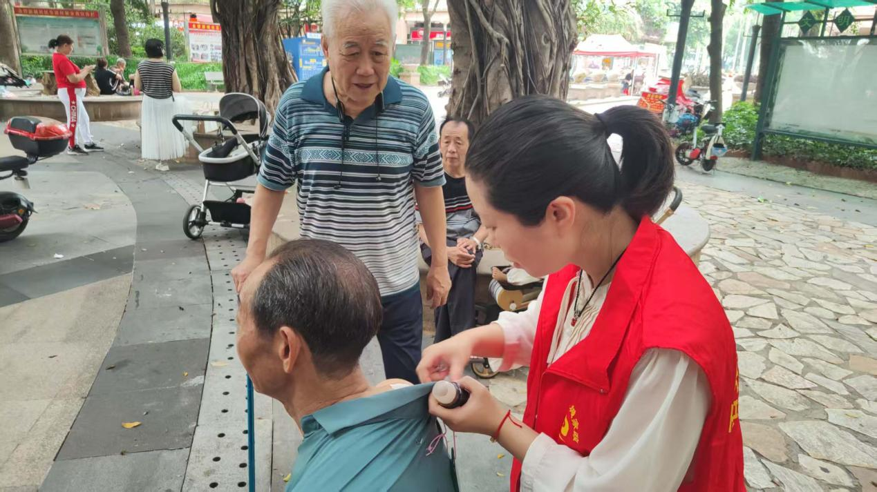 与此同时,艾草的清香弥漫在空气中。石井街南粤家政健康服务团队专注为老人们提供精油艾贴服务。他们仔细询问老人身体状况,精准选取穴位,将温热的艾贴敷上,帮助缓解关节酸痛、祛除湿气。几位体验后的婆婆开心地说:“最近天气闷热,肩膀沉甸甸的。贴上这个暖暖的,舒服多了,感觉轻松不少!”